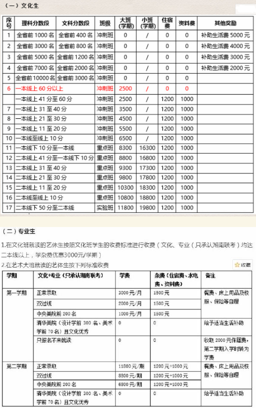 (1)艺术生文化、专业(只承认湖南联考)均达二本线以上,第一学期按1500元/月收取学杂费,全期收取1000元的资料费、活动费、水电费等;第二学期按文化班标准收费,学杂费优惠3000元;