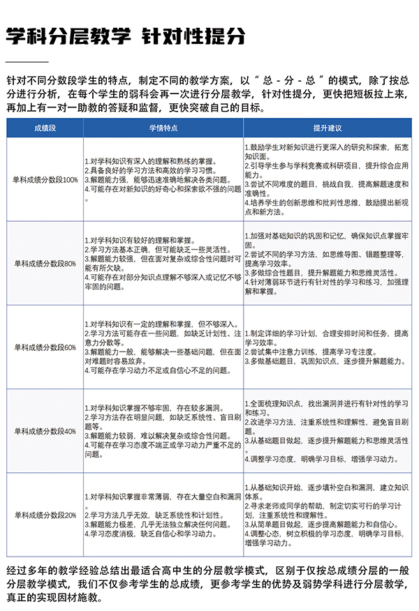 我们坚持每班不超过30人,根据学生各科高考成绩,实施分层教学。通过这种方式,能够让每个学生都实现教育增值。让优秀的学生更加卓越,让普通的学生不再平凡。在艺体生单独班级里,每一位学生都能找到最适合自己的学习节奏和提升路径,为高考的成功全力以赴。