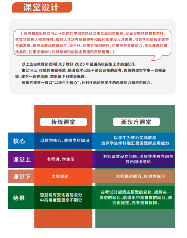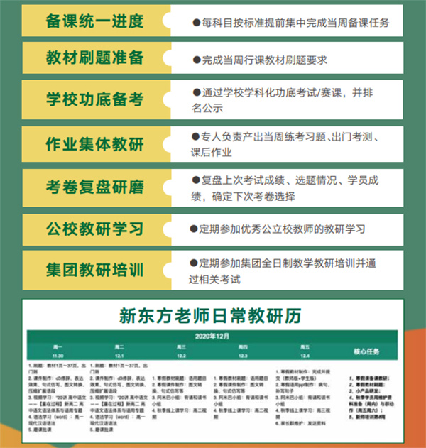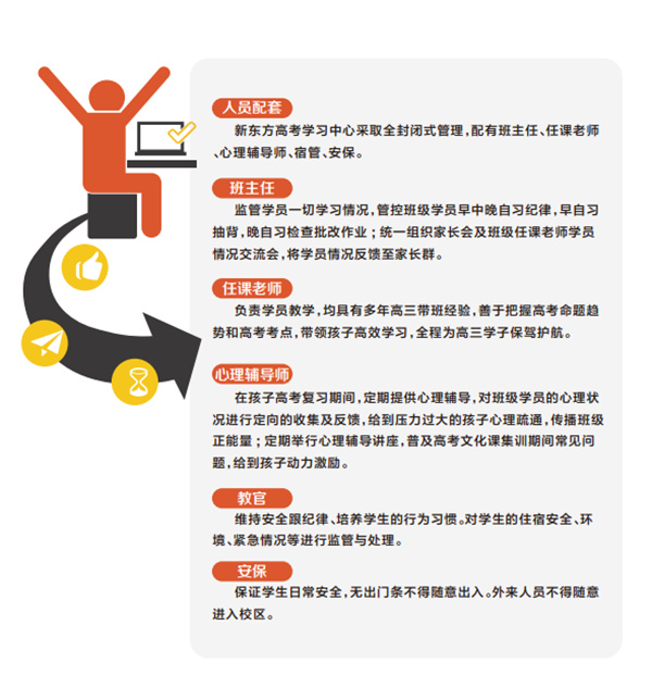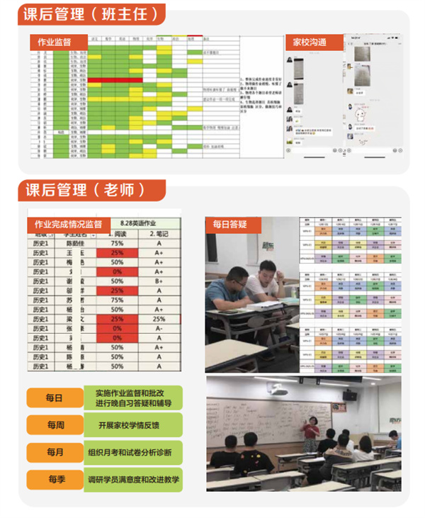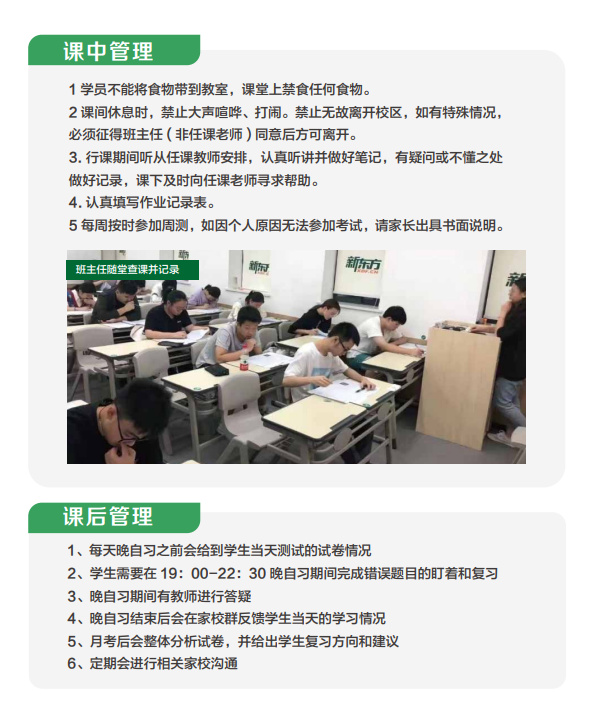 全日制高考学习中心在师资筛选上有极为严格的标准,成为一名合格的新东方老师需要经历“四面-四培-三审”的考核流程。在成为一名合格的新东方老师之后,要成为全日制高考学习中心梯队的老师又需要经过学科组对其经验、功底、绩效、留存等情况的重重考核与筛选。在教学过程中学科组跟盯课堂教学质量,严抓课后反馈,细查周测月测分析,督促教学计划落实情况。在学员管理过程中具备精细化的管理模式,对学生档案、日常管理、反馈回访、活动组织等方面的管理周全到位,根据学生类型制定个性化管理模式。