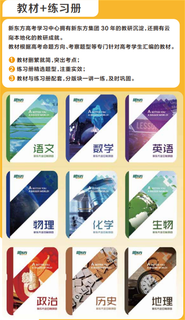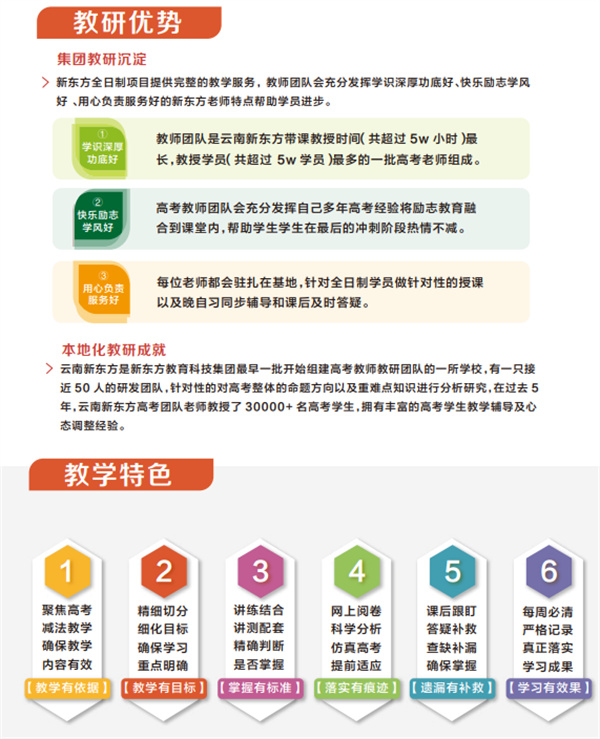 云南新东方全日制高考学习中心是云南新东方学校专注于高考生全科全日制教育而设立的项目,云南新东方培训学校是新东方教育科技集团于2006年7月在云南设立的分校。学校自成立以来一直秉承新东方集团统一的品牌、统一的师资调配,统一的学习教材、统一的授课质量、统一的投诉系统、统一的教学服务、统一的教学管理制度,从而确保了云南新东方培训学校能够为所有学员提供高水准的教学和服务。