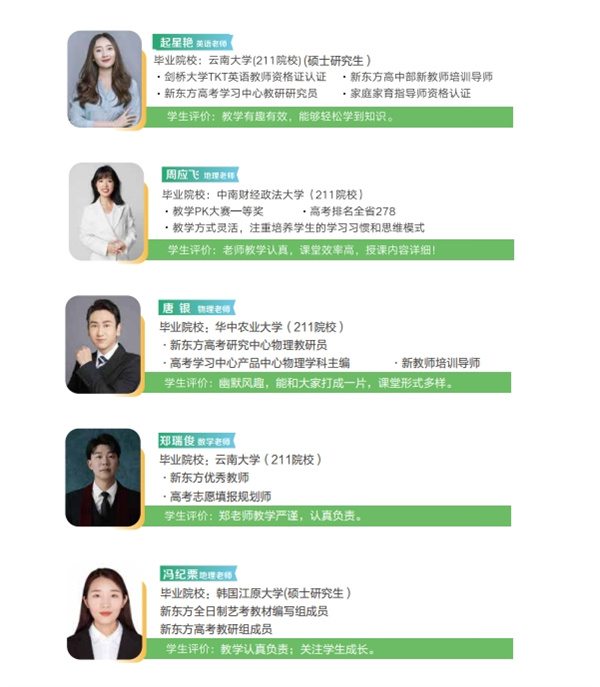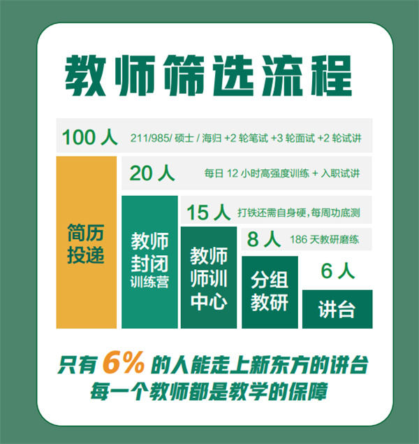 按照新东方集团规范化标准,新东方云南学校严格高考全日制教学师资选个标准,经历简历筛选、初次面试、精英集训、最终面试、岗前培训五大环节。