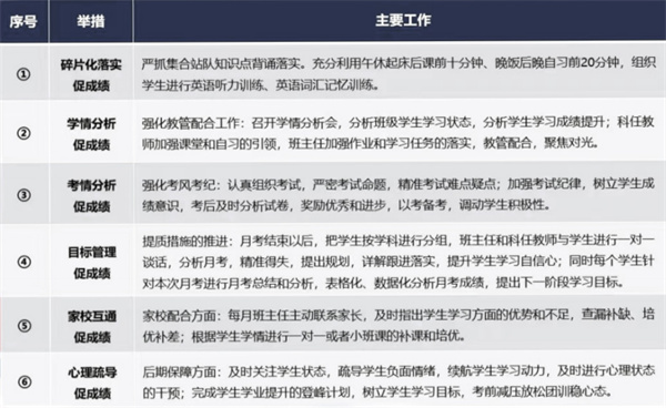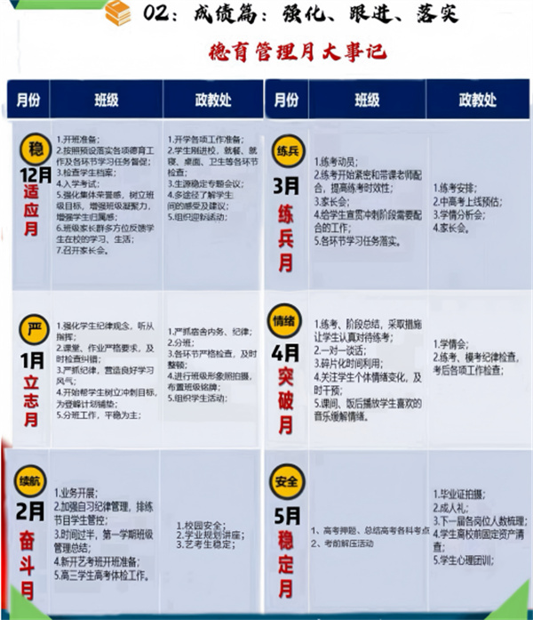 我们对老师和学生都遵循一个道理:只用成绩说话。老师保持一个理念:教好书,更要教得好!学生保持一个概念:只有学习,更要学得好学生必须摒除一切杂念,即乱七八糟、不切实际虚无缥缈的想法,践行踏踏实实心无旁骛、勤学苦练。教师时刻关注学生心理情感变化,杜绝学生谈恋爱,禁止沉迷手机等电子产品。