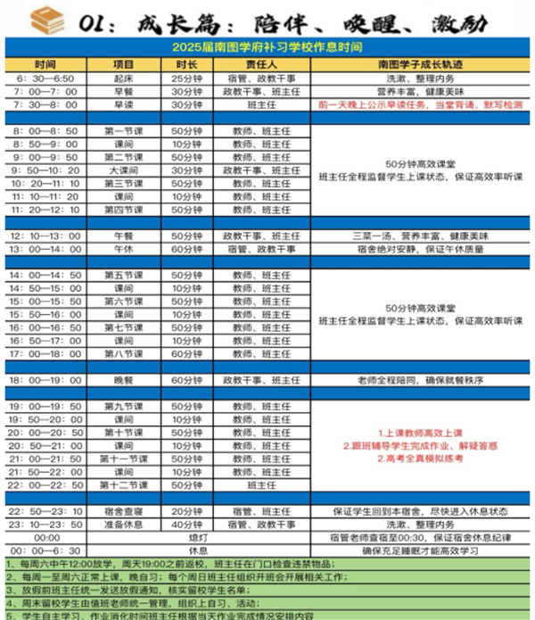 学校全封闭寄宿制管理,禁止学生使用手机、游戏机等电子设门岗24小时值班不能随意请假外出,最大程度上减少外界对学习的干扰。学校设施齐全,宿舍24小时热水供应,师生同吃一个食堂。