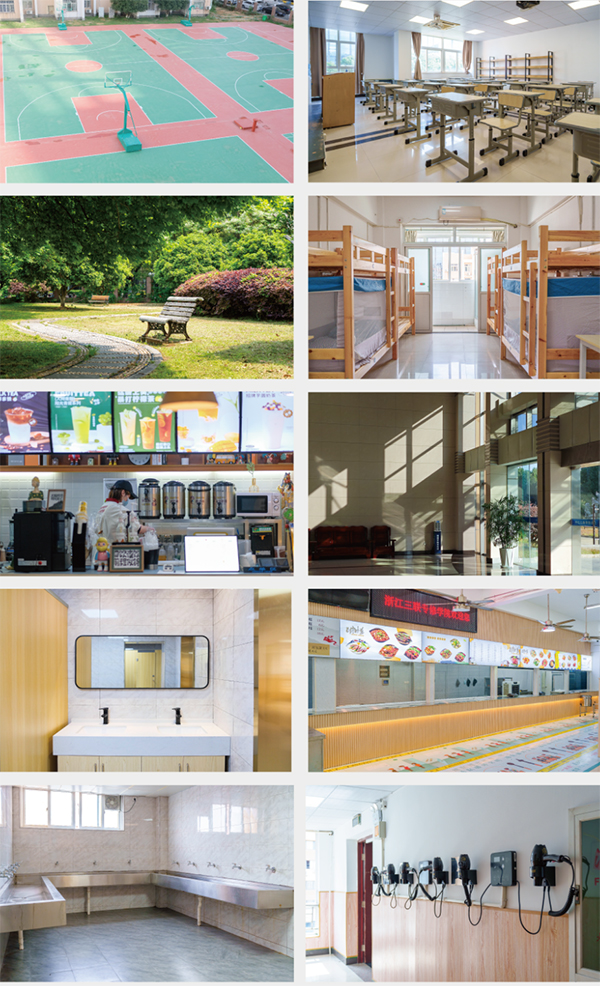 三联高复紫金港校区拥有独立校园,封闭管理。教学楼、宿舍、食堂、超市、运动场、小公园等硬件齐全,校园生活幸福指数高。