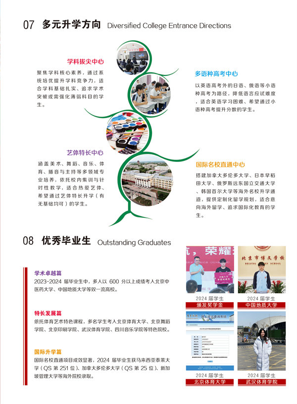 2.多元升学:支持日语/俄语替代英语高考;设有田径、美术、舞蹈(国标舞)特长方向;还有日本早稻田大学、加拿大多伦多大学直通车,及俄罗斯远东交通大学预科班。