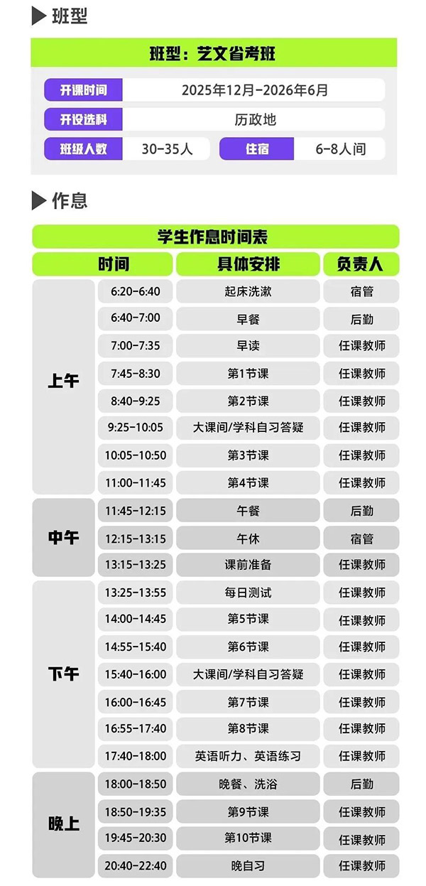 2024届高考复读集训采取寄宿制全封闭管理模式,统一管理,并配有全职班主任、任课老师、心理辅导师、教官、保安等。