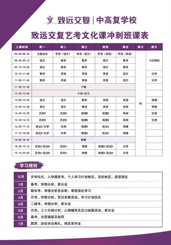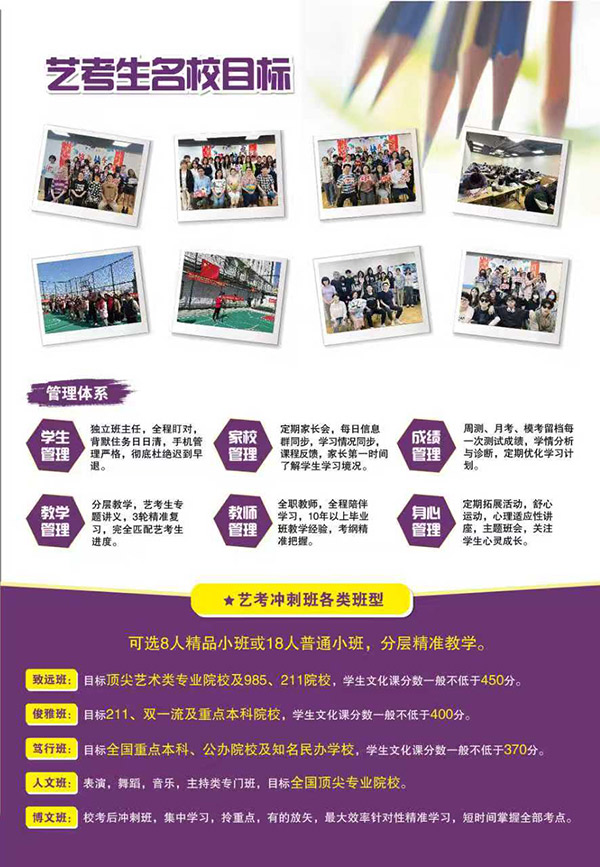 博雅班:目标顶尖艺术类专业院校及985、211院校,学生文化课分数一般不低于450分。