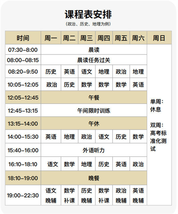 复读班教室每天都会有1名教学老师在晚自习坐班,其余所有学科老师在教室外值班,确保学生所有学术上的问题都能够及时得到解答,保障学习效果。与学生同吃同住校园,全过程辅导陪伴,五一、国庆、春节等较长假期学校也会为学生提供学习指导。学校组织阶段性班级生情分析会、导师分享会、模考总结会,让各科老师联合会诊,多维施策,及时调整个性化培养方案,使提分路径更加灵活科学:学校定期举行“学生、家长、班主任”三方恳谈会,深入推动家校协同育人。